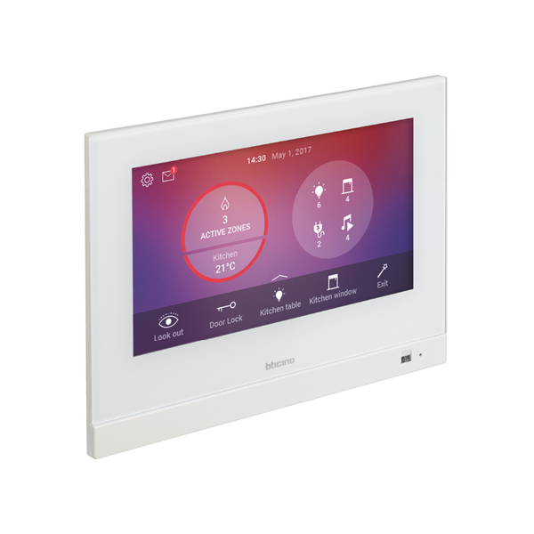 Der Hometouch ist sowohl Steuerzentrale für Ihre MyHOME-Hausautomation als auch Video-Hausstation mit integrierter Smartphone-Anbindung. Über den Hometouch steuern und verwalten Sie Ihre komplette Hausautomation, wie z. B. Licht und Rollladen betätigen, Heizung regeln, Szenarien abrufen, u.v.a.m. Mittels kostenloser App „Door Entry for Hometouch“ bekommen Sie auch die komplette Funktionalität einer Sprechanlage auf Ihr Smartphone (Videobild, Gespräch, Tür öffnen, usw.).